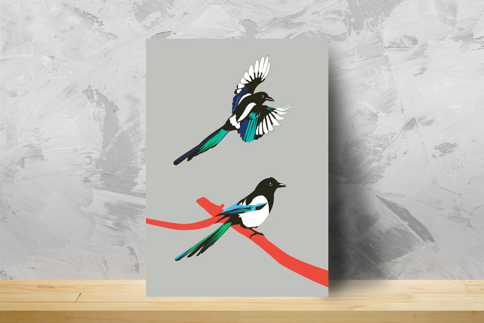 The enigmatic Magpie. Part of a series of Irish wildlife illustrations. They are imbued with Irish spirit and harness the power of colour to uplift and inspire.