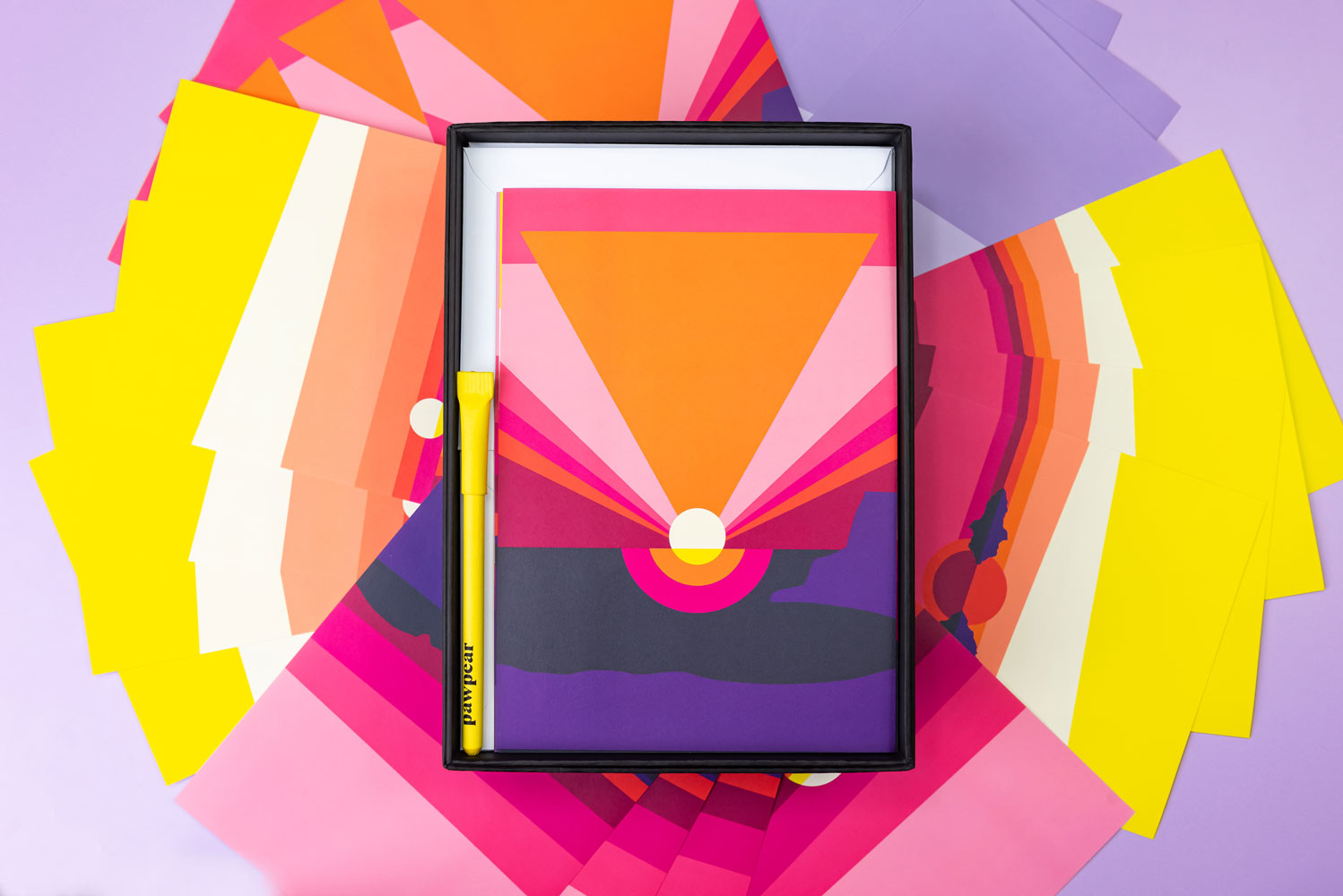 Presented in a luxury box wrapped with black kraft paper and adhesive label, this writing paper is made from 120gsm premium white paper and comes with 120gsm white envelopes and a black ink pen made from recycled kraft paper. Box contains five of each design, printed on one side.