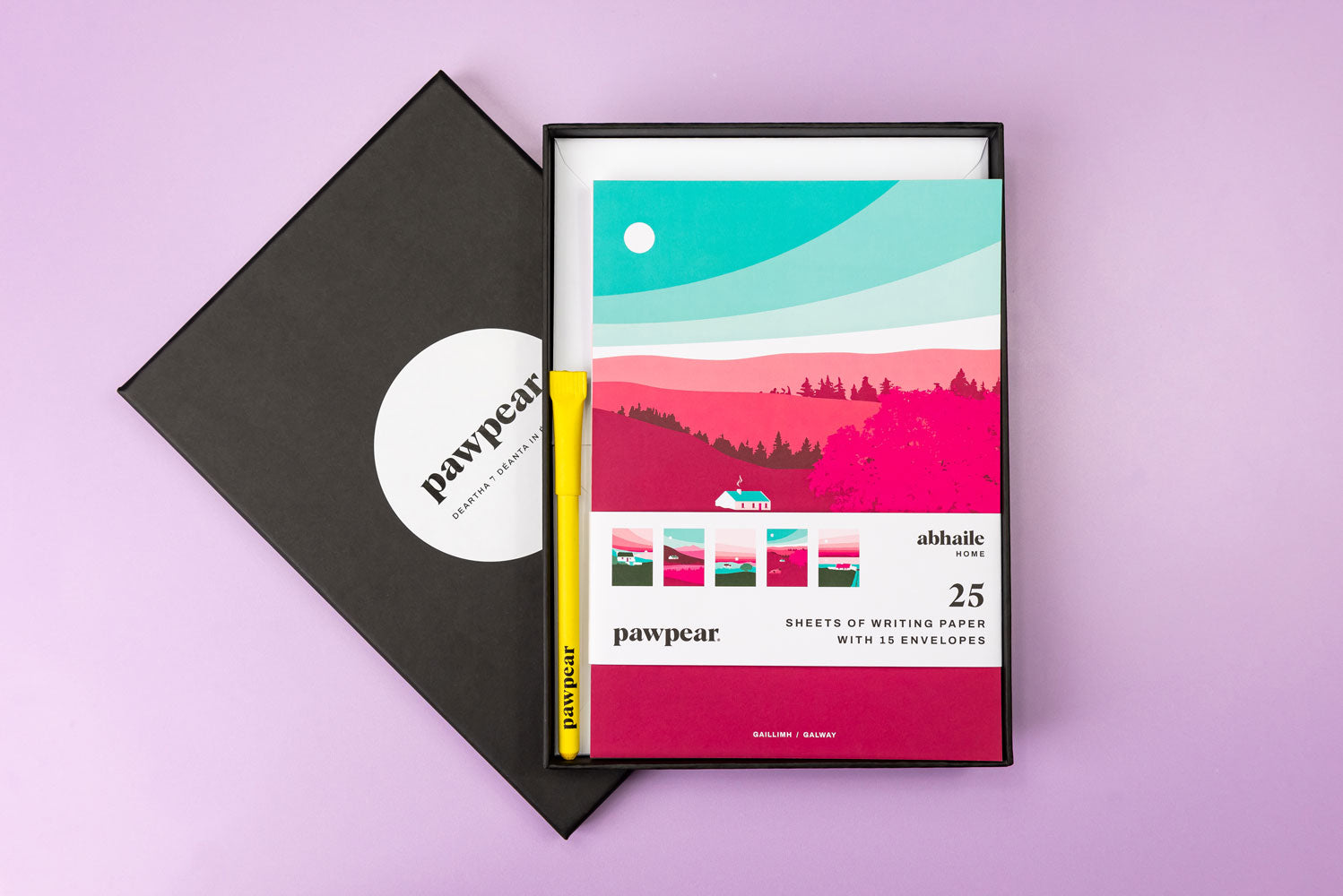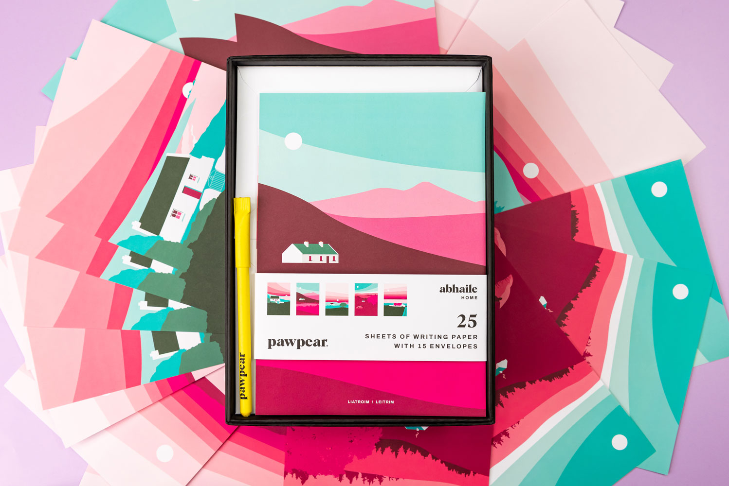 Abhaile/Home Writing Set The set includes 25 sheets of A5 writing paper with 15 envelopes and paper pen, featuring colourful depictions of five houses five houses nestled in the landscape across Ireland: Waterford, Leitrim, Galway, Kerry, and Clare. Irish language with English translation.