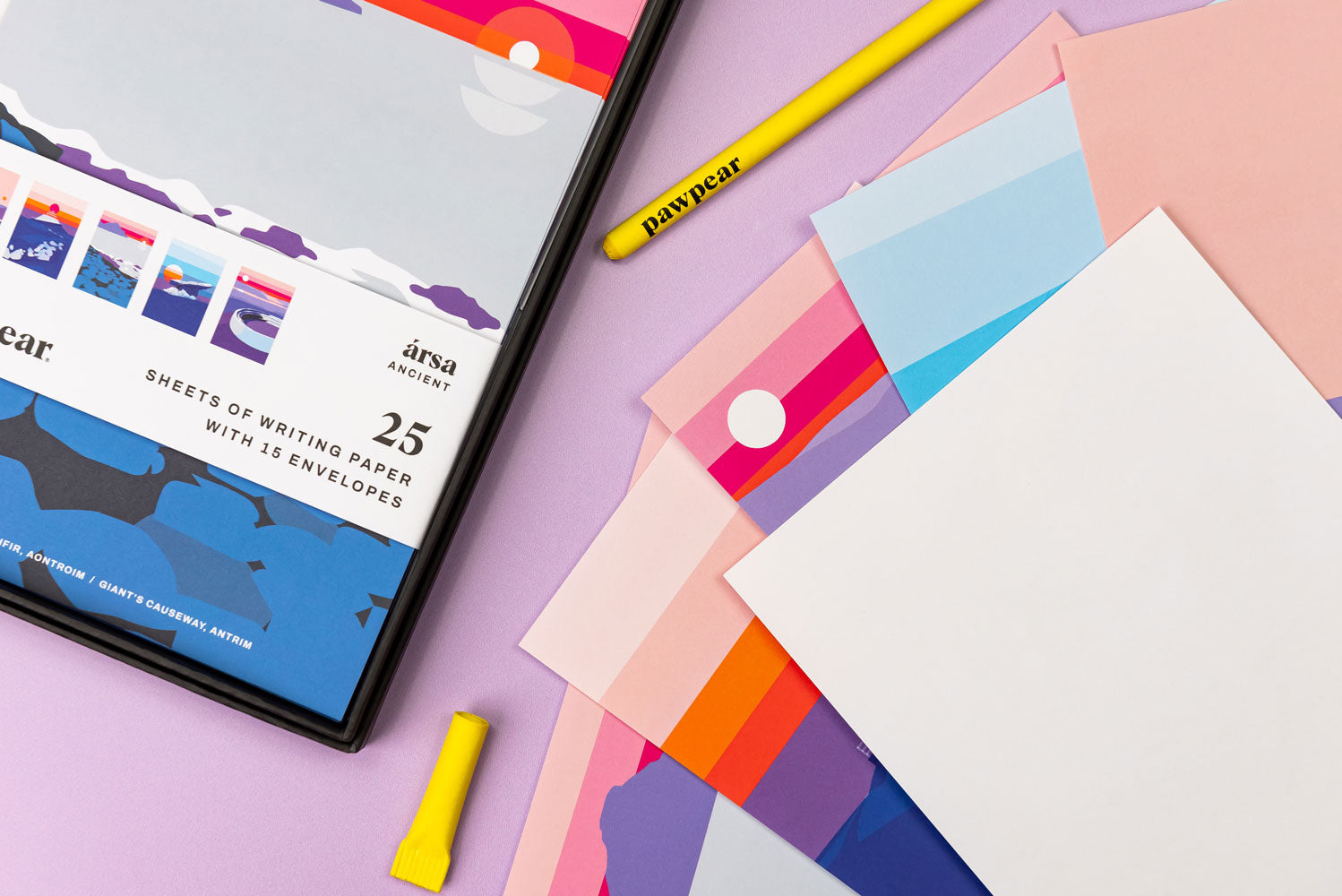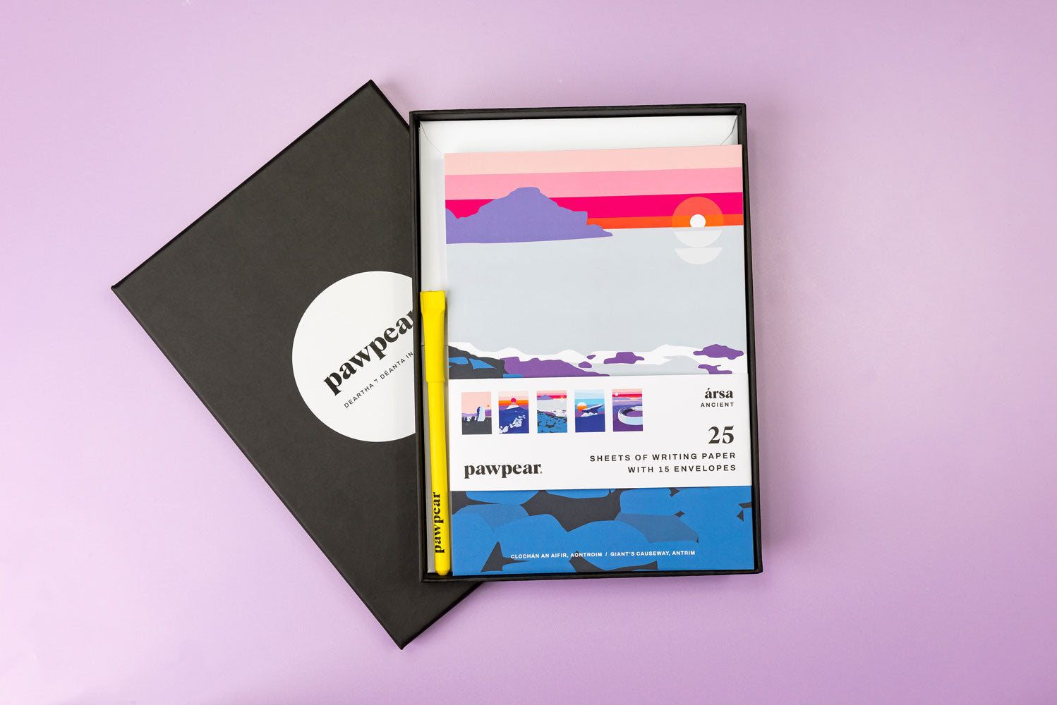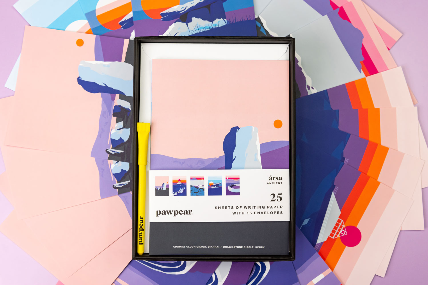 Ársa / Ancient Writing Set The set includes 25 sheets of A5 writing paper with 15 envelopes and paper pen, featuring colourful depictions of ancient sites across Ireland: Poulnabrone, Céide Fields, Giant's Causeway, Uragh Stone Circle and Greenan Fort. Irish language with English translation.