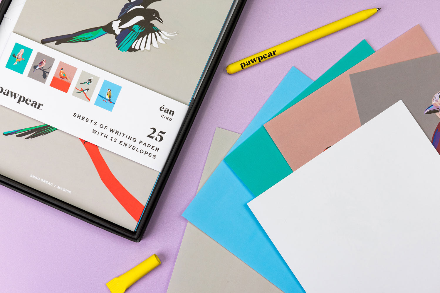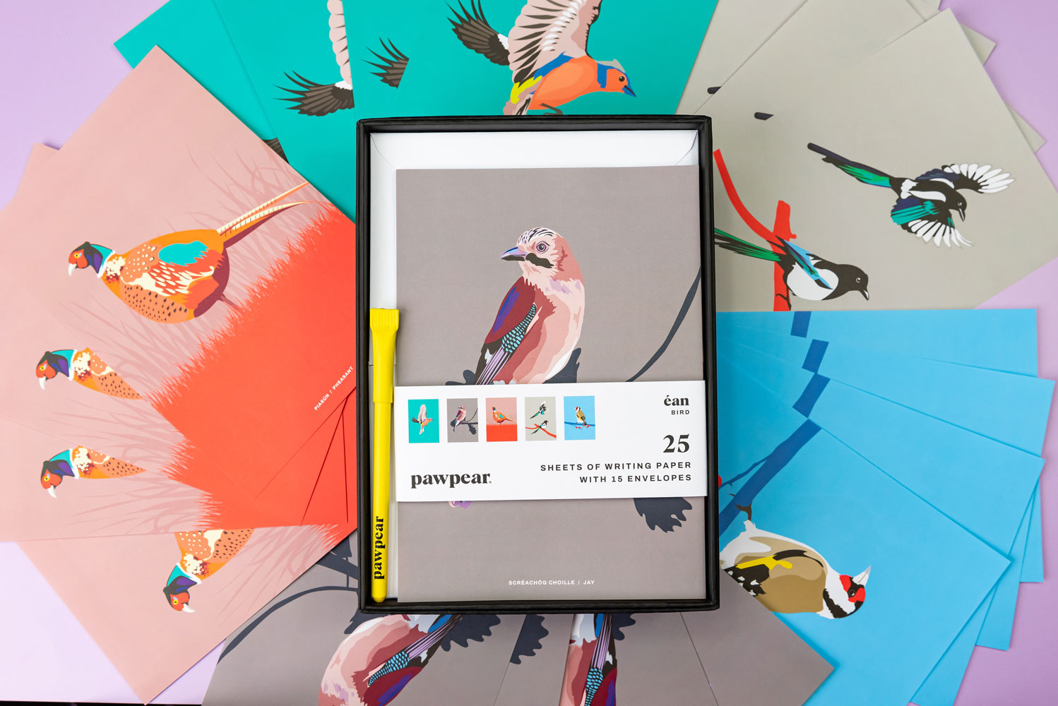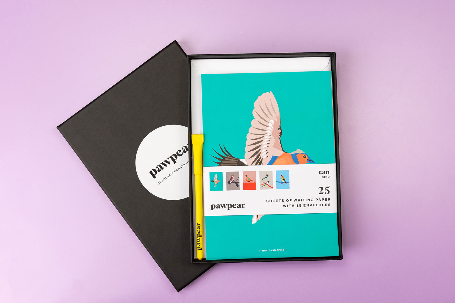 Ean/Bird Writing Set The set includes 25 sheets of A5 writing paper with 15 envelopes and paper pen, featuring colourful depictions of birds found in Ireland: Jay, Magpie, Goldfinch, Chaffinch and Pheasant. Irish language with English translation.