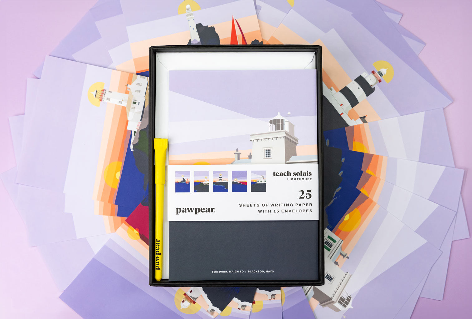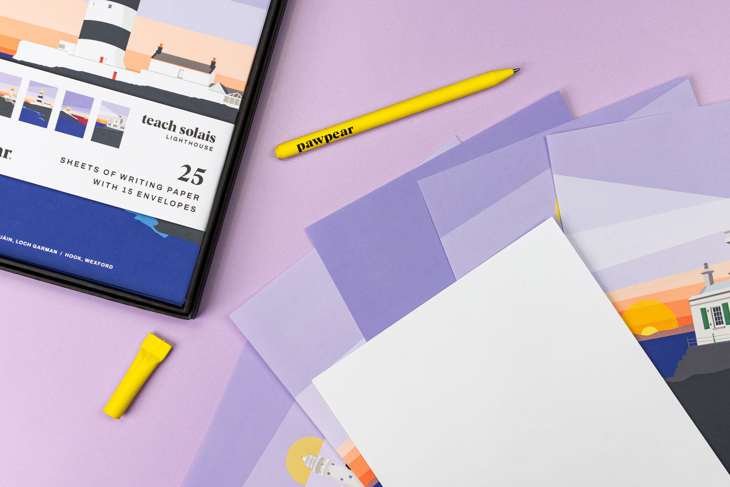 Teach Solais / Lighthouse – Writing Set The set includes 25 sheets of A5 writing paper with 15 envelopes and paper pen, featuring colourful depictions of five lighthouses along the coast of Ireland: Youghal and Fastnet in Cork, Hook in Wexford, Blacksod in Mayo, and Fanad in Donegal. Irish language with English translation.