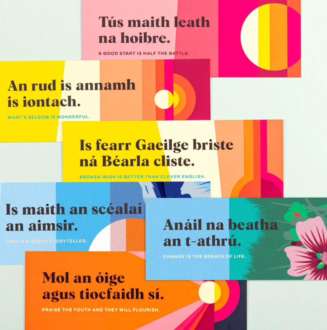 A set of 6 illustrated bookmarks, each featuring a unique seanfhocal – traditional Irish proverb – a unique window in the wit and wisdom of our ancestors.