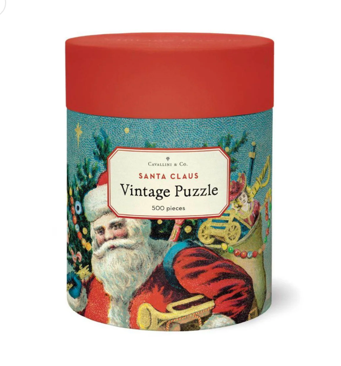 When you finish you will see Santa loaded and ready for Christmas eve! Cavallini's 500 piece puzzles are packaged in a 6.5 inch long cardboard tube, with puzzle pieces safely stored in a muslin bag inside. Finished puzzle measures 14 by 22 inches.