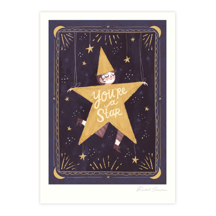 A beautiful “You’re A Star” illustration, in navy and gold by Rachel Cocoran. Inspired by childhood imagination and adventure.
